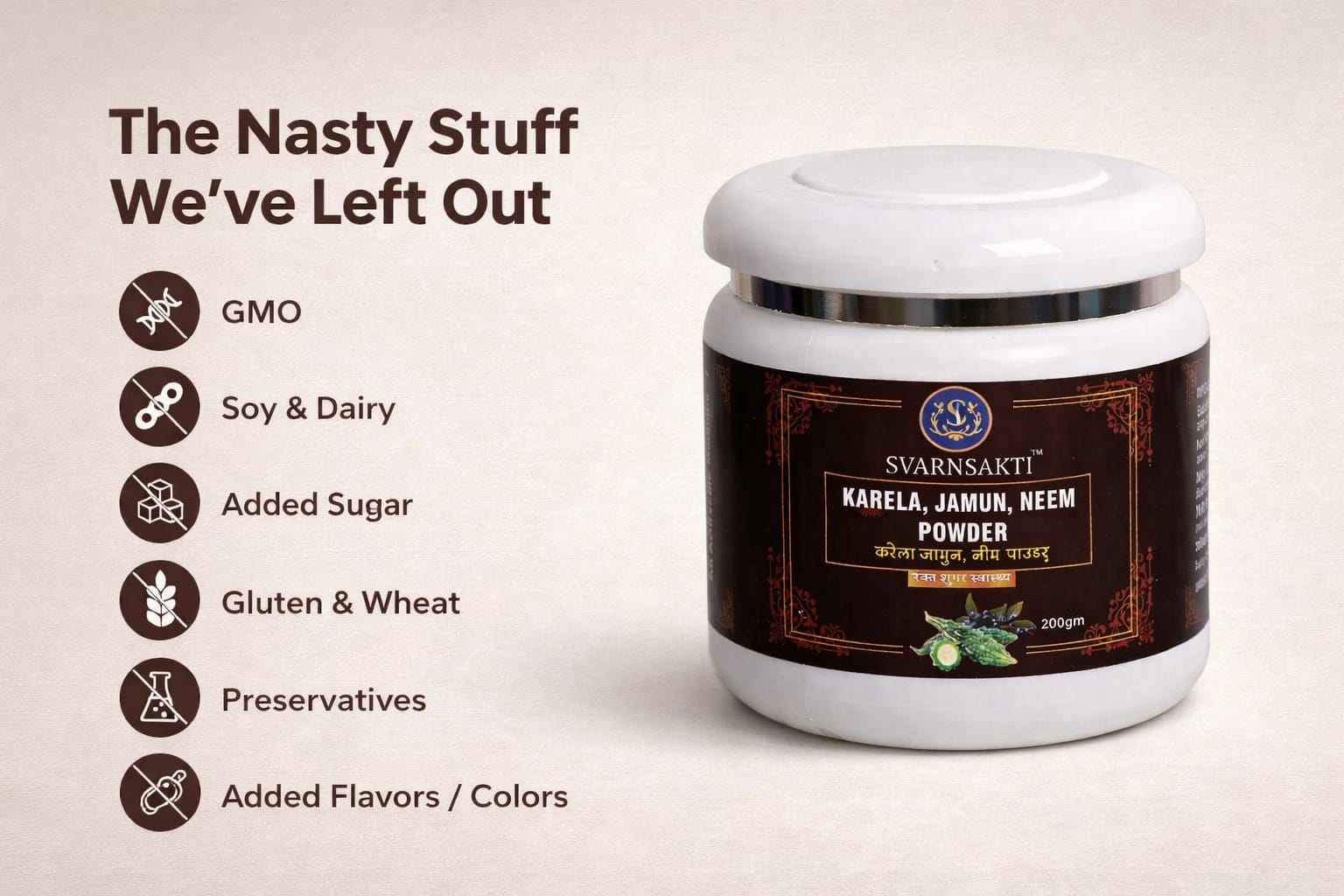 Svarnsakti Karela Jamun Neem Powder is a thoughtfully crafted herbal blend inspired by traditional Ayurvedic practices. This natural formulation combines Karela (Bitter Gourd), Jamun (Indian Blackberry), Neem, and other potent herbs to support metabolic wellness and healthy blood sugar balance as part of a balanced lifestyle.